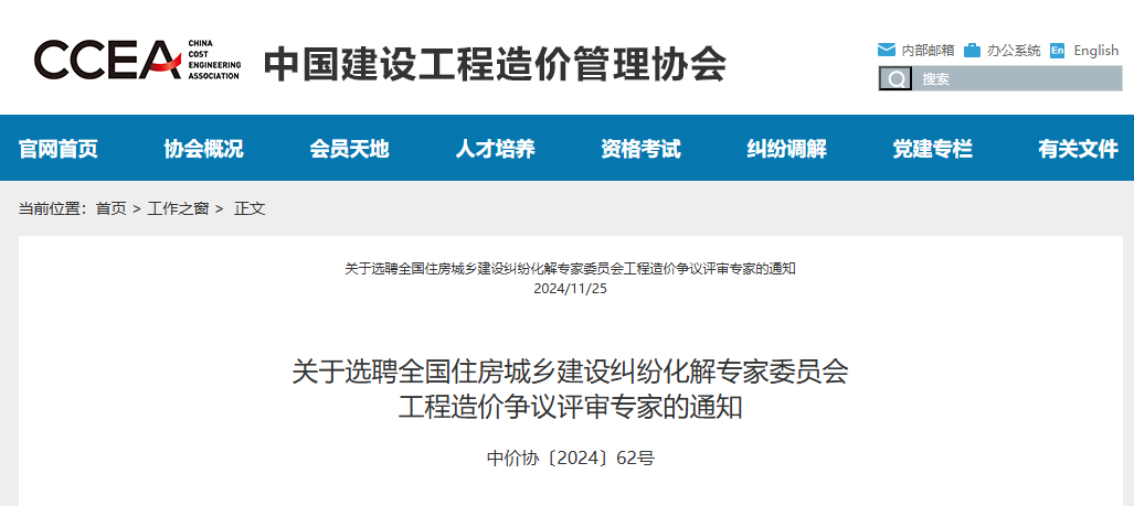 近日,中国建设工程造价管理协会发布《关于选聘全国住房城乡建设纠纷化解专家委员会工程造价争议评审专家的通知》,在相关专业领域从业至少15年以上,具有高级职称或同等专业水平,具有相关专业领域的注册资格、职业资格或同等能力。